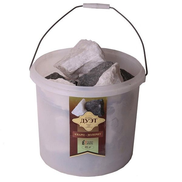 Кварцит и долерит колотые. Рекомендуется укладывать долерит в каменку вместе с кварцем 1:1. В этом случае обжигающий пар от кварца смягчится легким паром от долерита. В тоже время, он будет служить аккумулятором тепла, а кварц его проводником.
