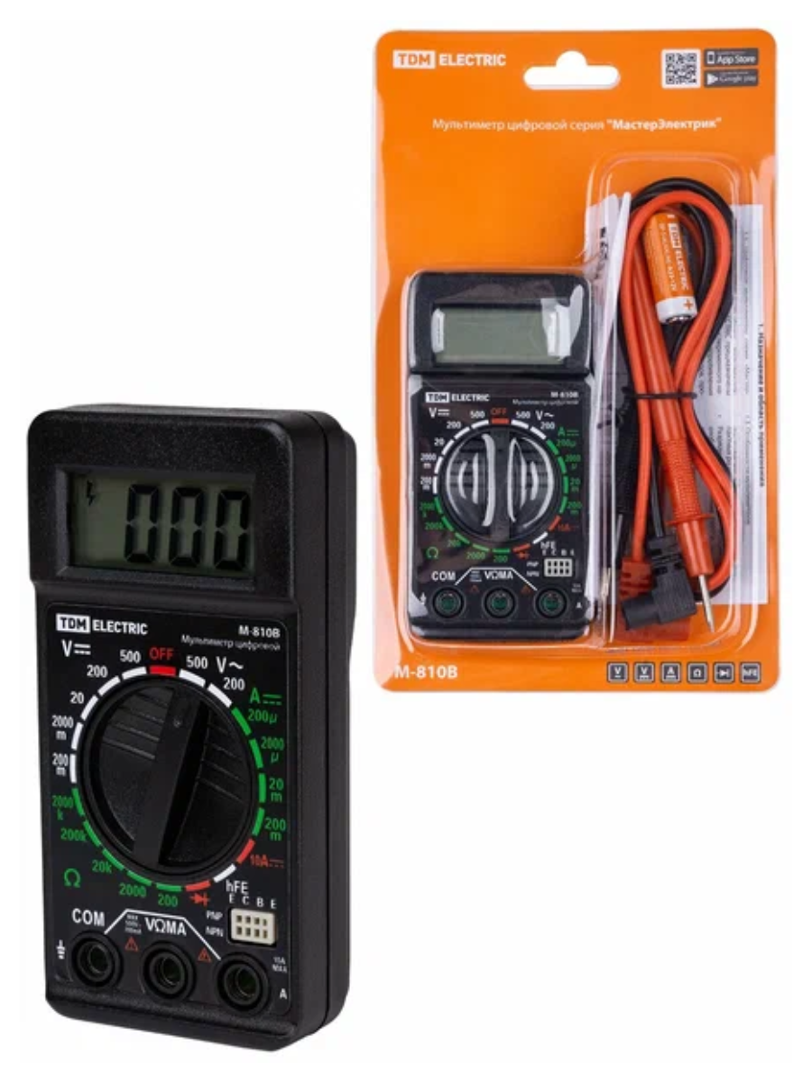 Мультиметр цифровой серия "МастерЭлектрик" М-810В (компакт) SQ1005-0009 TDM предназначен для измерения постоянного и переменного напряжения и тока, сопротивления цепей, проверки диодов, проверки целостности цепи и др.