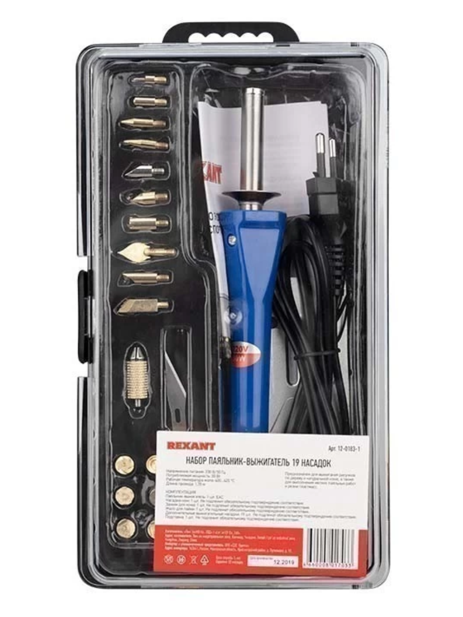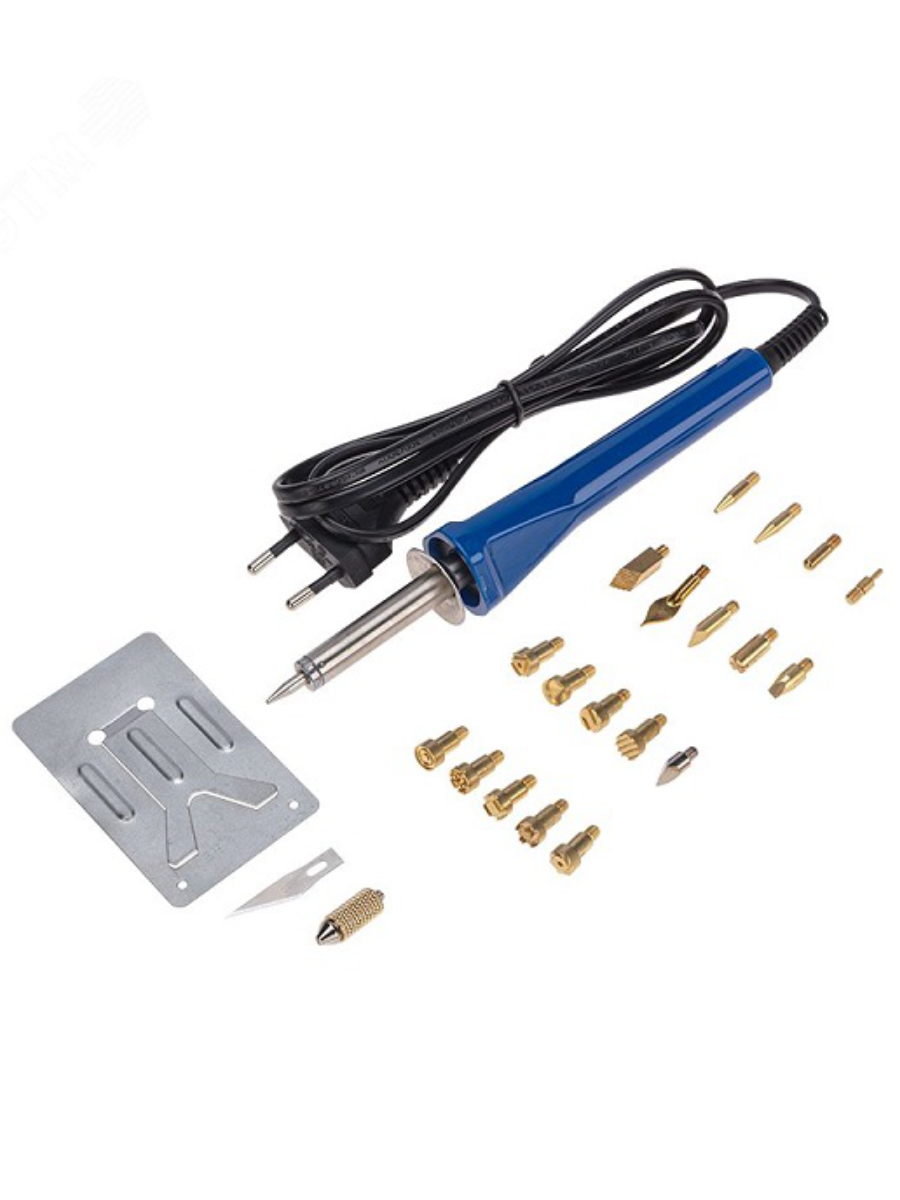 В комплект входит: паяльник, жало для пайки, выжигательные насадки 19 шт., насадка-нож с цанговым зажимом, металлическая подставка.