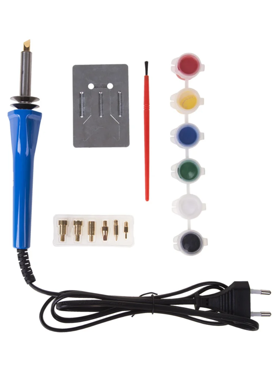 В комплект входит: паяльник, жало для пайки, выжигательные насадки 6 шт., краски 6 шт., металлическая подставка и кисточка.