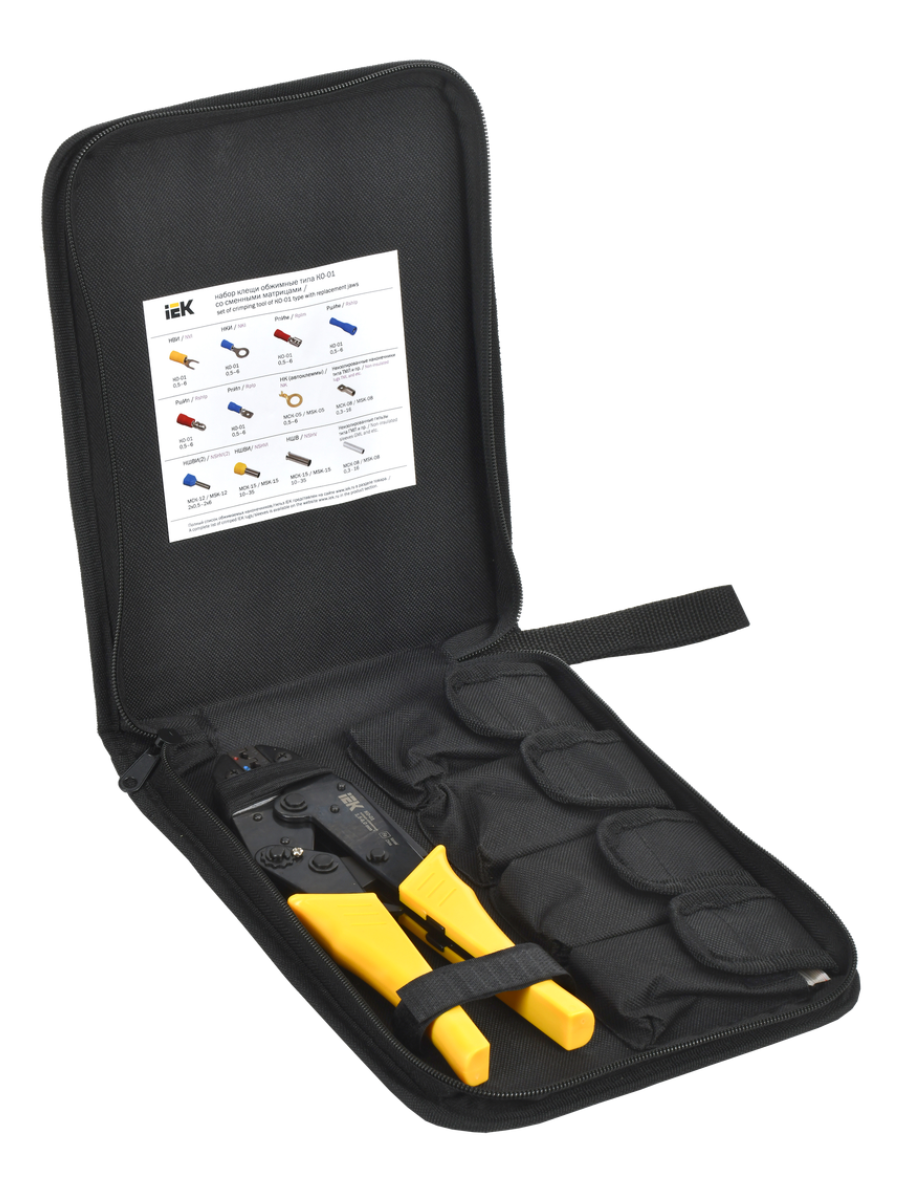 Клещи обжимные КО-01 + 4 сменных матриц ARMA2L 3 A2L3-NK11-05-01 IEK предназначены для опрессовки различных видов и размеров изолированных и неизолированных наконечников, разъёмов и гильз. Набор клещей обжимных КО-01 со сменными матрицами МСК-05, МСК-08, МСК-12, МСК-15 серии ARMA2L 3.