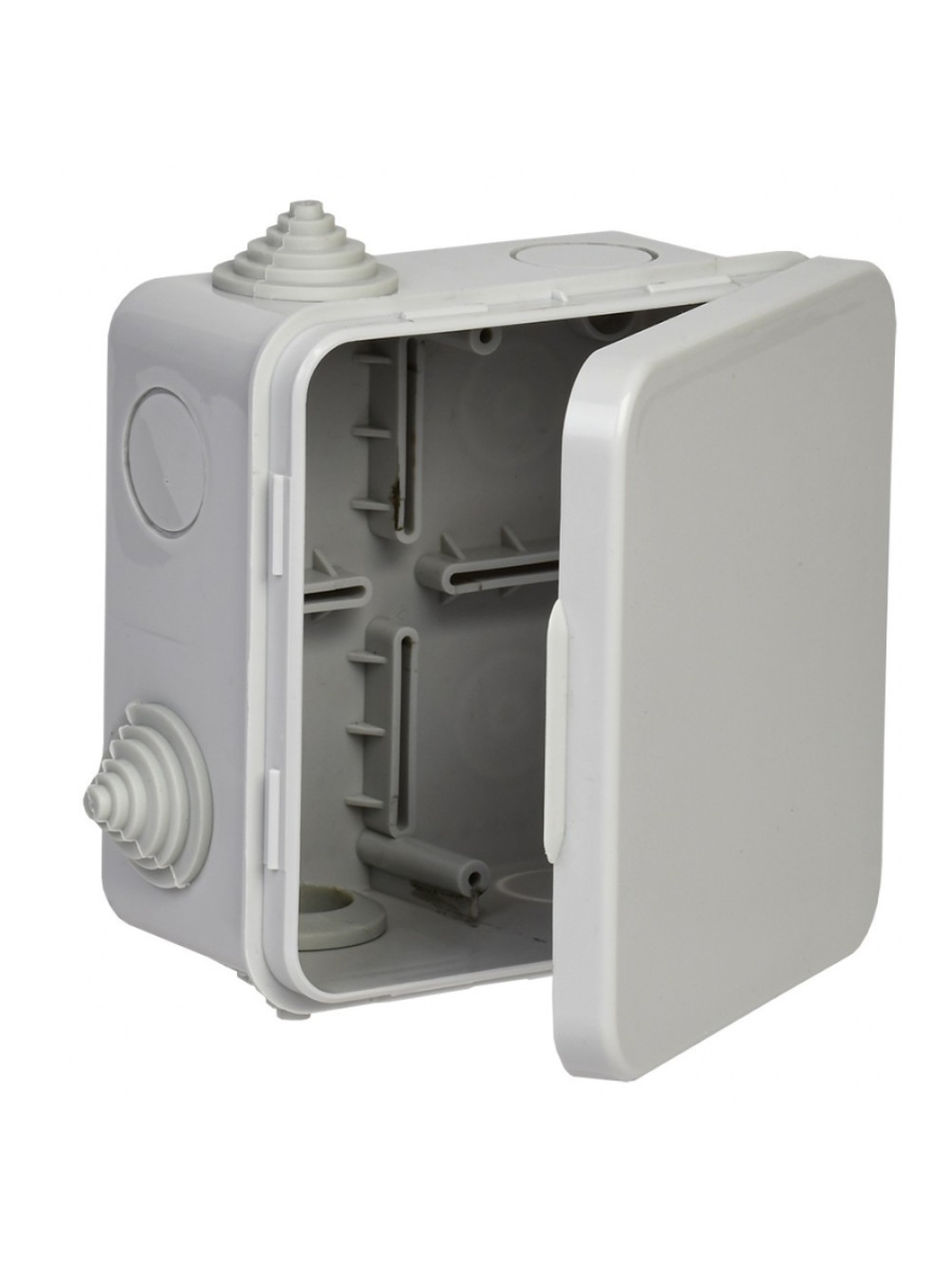 Коробка распределительная ОП 100х100х50 мм IP54 4 гермоввода UKO31-100-100-050-K03-54G IEK с откидной крышкой отличное дополнение для выполнения электромонтажных работ с гофротрубами и держателями-клипсами GENERICA. Крышка коробки откидывается и при этом остается на ней, что ускоряет и облегчает монтаж. Плотное закрывание крышки защелкиванием возможно без использования инструментов. В коробке имеются универсальные посадочные места для клеммных колодок. В комплект коробки входят ступенчатые сальники (гермовводы) для присоединения гофрированных или гладких труб.