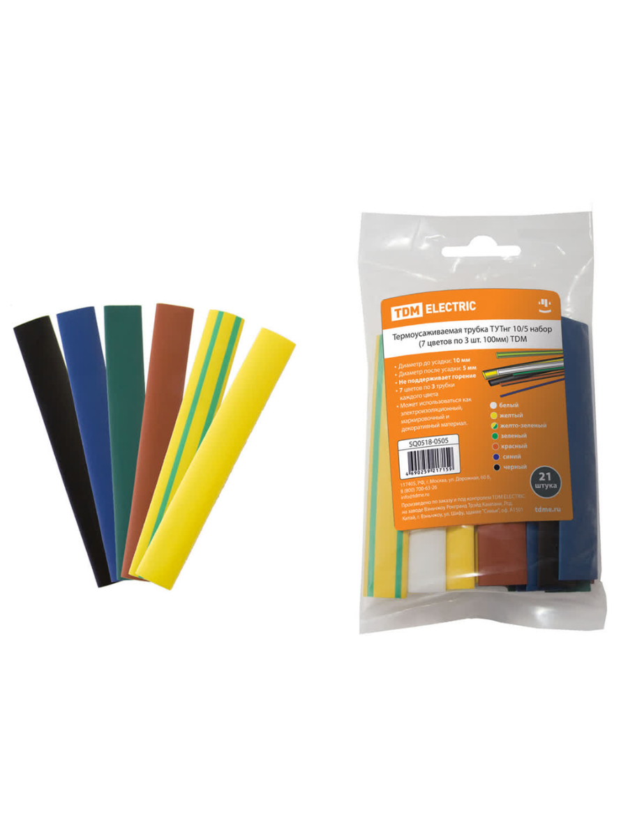Набор трубок термоусадочных ТУТ 10/5 (7 цв. по 3шт/10см) SQ0518-0505 TDM используется как электроизоляционный, маркировочный и декоративный материал. Предназначена для изоляции кабелей, изолирования жил, мест соединения проводов, бандажирования жгутов проводов, для механической защиты изделий, для защиты от грязи, для цветовой маркировки изделий и т. д. Основное качество термоусаживаемой трубки – способность сжиматься под воздействием высокой температуры. Процесс усадки происходит очень быстро, трубка ТУТ полностью повторяет контуры предмета. Можно использовать тепловой пистолет, что делает термоусаживаемую трубку легкой в бытовом применении, например, в качестве альтернативы изоляционной ленте.