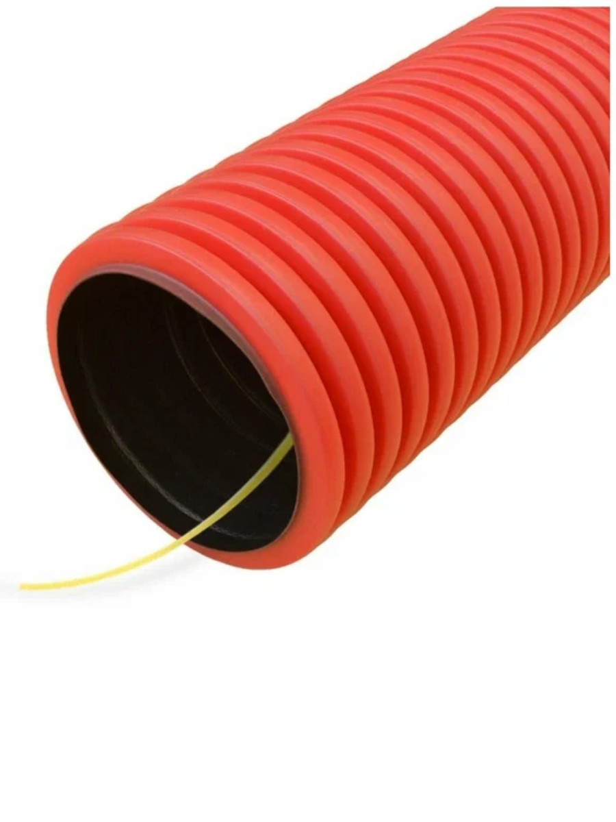 Труба гофрированная ПНД двустенная гибкая d50мм с муфтой красная PR15.0021 Промрукав предназначена для защиты изолированных проводов и кабелей от механических повреждений и агрессивного воздействия окружающей среды. Используются при прокладке в земле. Благодаря высокой коррозионной и химической стойкости трубы очень долговечны, гарантированный срок эксплуатации не менее 100 лет. Наряду с устойчивостью к статическим и динамическим нагрузкам, трубы имеют высокую степень защиты от механических воздействий. Дополнительным преимуществом является легкость монтажа, за счет малого веса и большой длины бухт. В двустенных гофрированных гибких трубах используется полиамидная леска - зонд, которая служит для присоединения специальной протяжки для кабеля. В комплект всех гибких двустенных гофрированных труб входят два уплотнительных кольца и одна соединительная муфта для обеспечения степени защиты IP68.