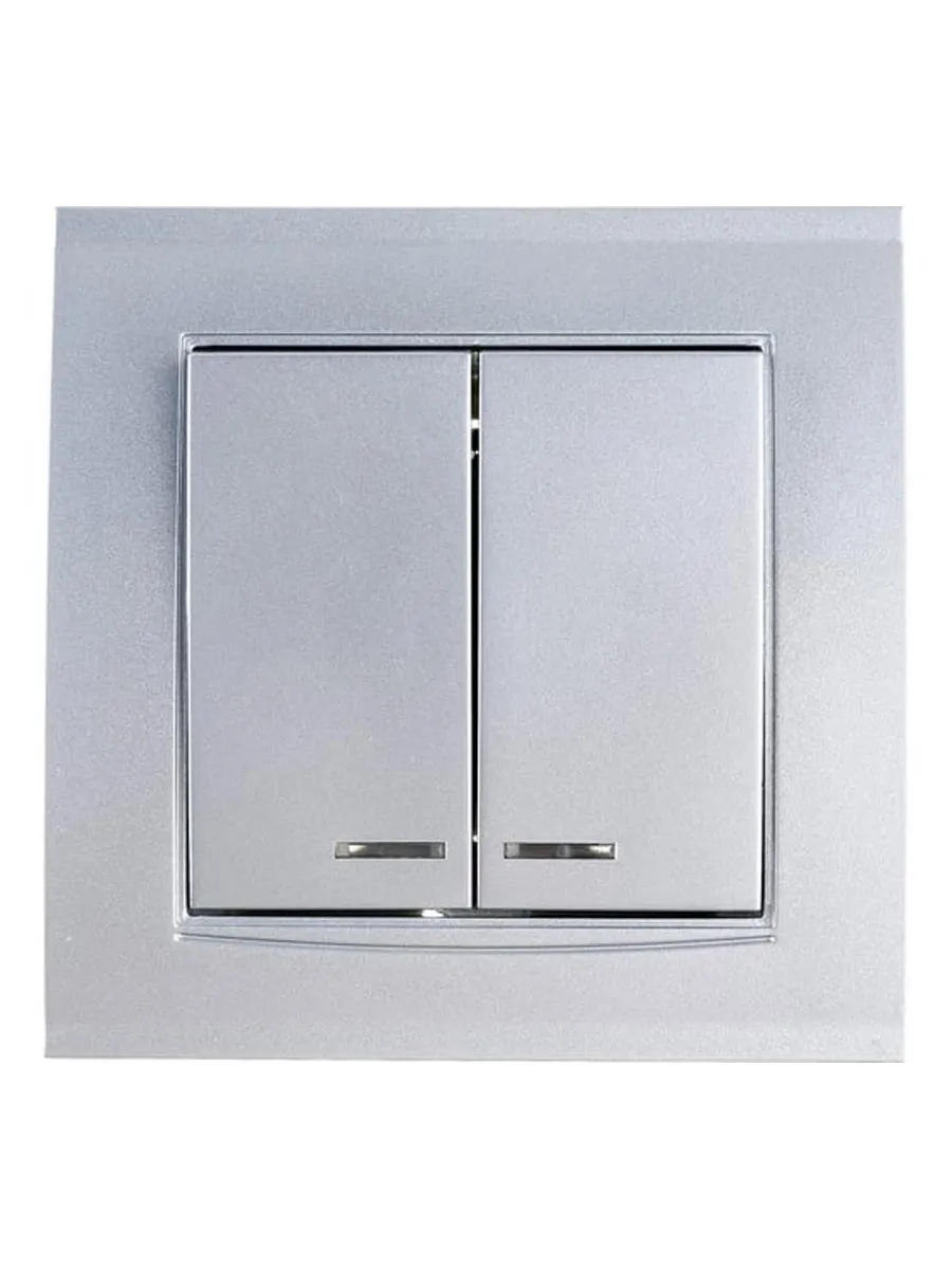 Выключатель 2-клавишный СП Бриллиант 10А IP20 с подсветкой (цвет серебро) двухпозиционный коммутационный аппарат с замыкающими (нормально-разомкнутыми) контактами, предназначенный для работы в сетях с напряжением до 1000 вольт, не предназначенный для отключения токов короткого замыкания, без специальных устройств дугогашения, местного управления, с ручным приводом. Применяется для включения и выключения освещения в бытовых и производственных условиях.
