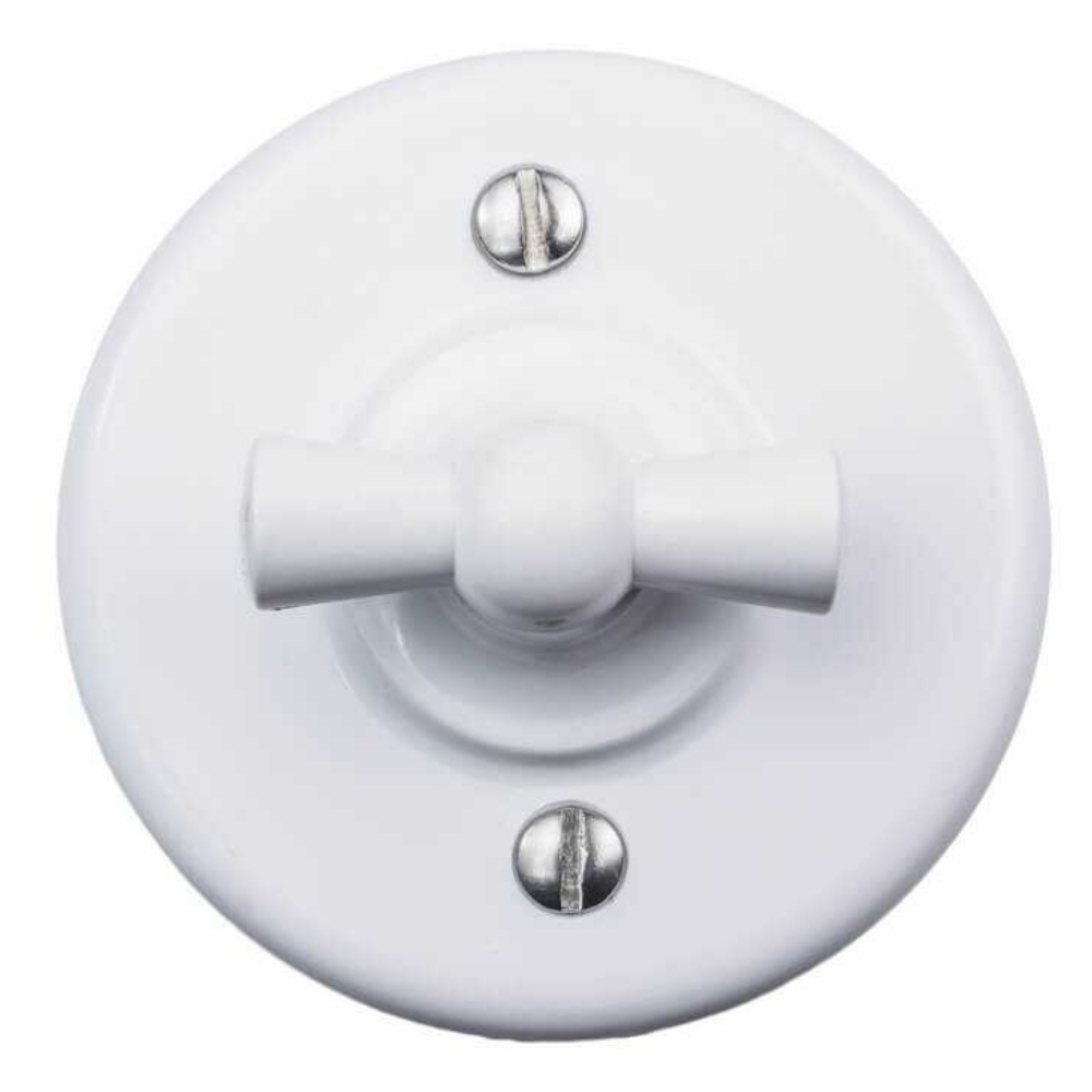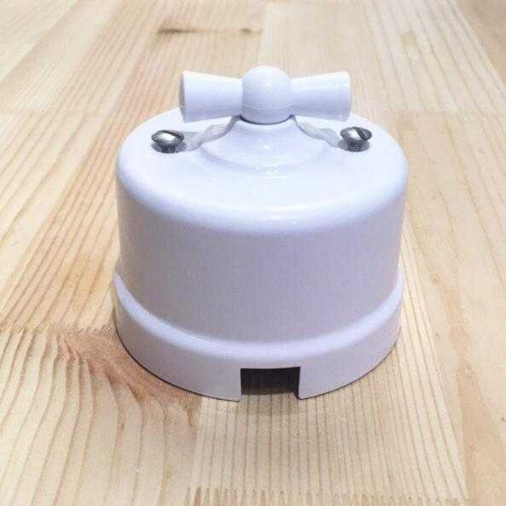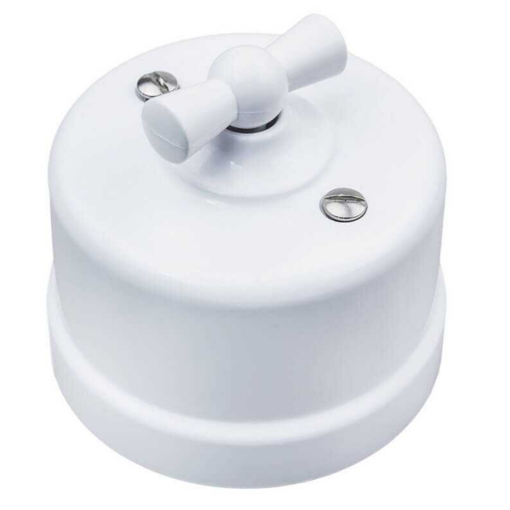 Выключатель поворотный 1-клавишный открытой установки Лизетта 10А IP20, стиль Ретро (цвет Белый) имеет 2 положения и изготовлен из прочного ABS-пластика. Применяется при классических интерьерных решениях, так и в стилях лофт, стимпанк, эко.