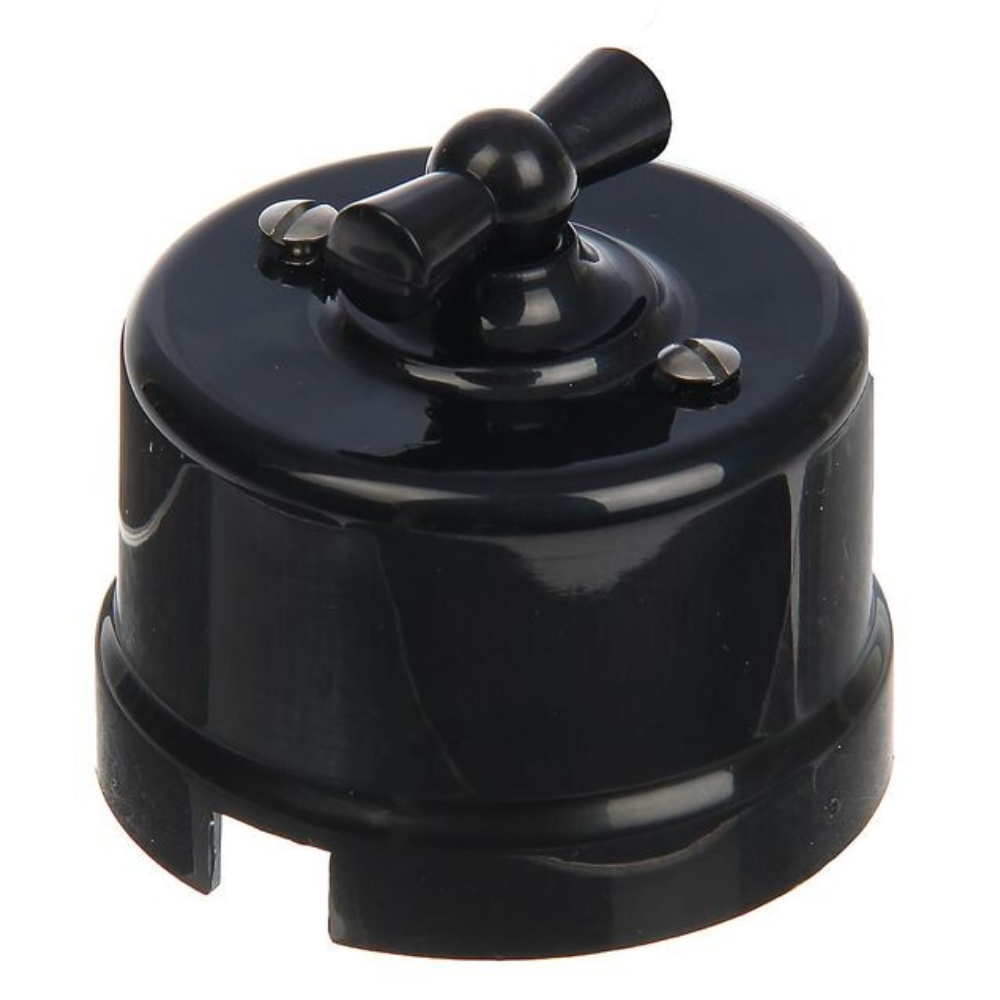 Выключатель поворотный 1-клавишный открытой установки Лизетта 10А IP20, стиль Ретро (цвет Черный) имеет 2 положения и изготовлен из прочного ABS-пластика. Применяется при классических интерьерных решениях, так и в стилях лофт, стимпанк, эко.