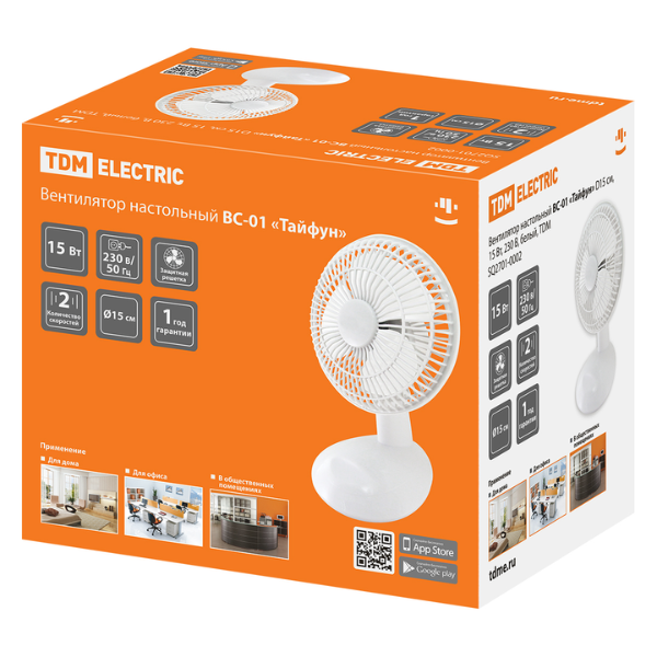 Вентилятор настольный ВС-01 "Тайфун" 15 Вт, 230 В, белый SQ2701-0002 TDM применяется для обеспечения циркуляции воздуха и поддержания комфорта в жилых и общественных помещениях. Материал решетки – металл, материал корпуса – нержавеющая сталь/пластик.
