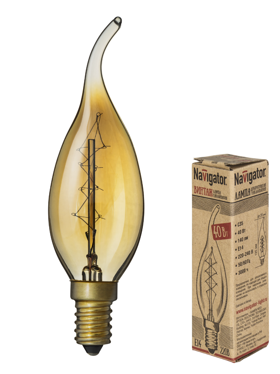 Лампа накаливания E14 40Вт 230В декоративная свеча на ветру золотистый винтаж 71952 Navigator предназначена для освещения жилых и коммерческих помещений. Станет идеальным элементом оформления интерьеров в стиле лофт, ретро, винтаж, кантри, стим-панк и т.п. Имеет золотистую стеклянная колбу и предохранитель.