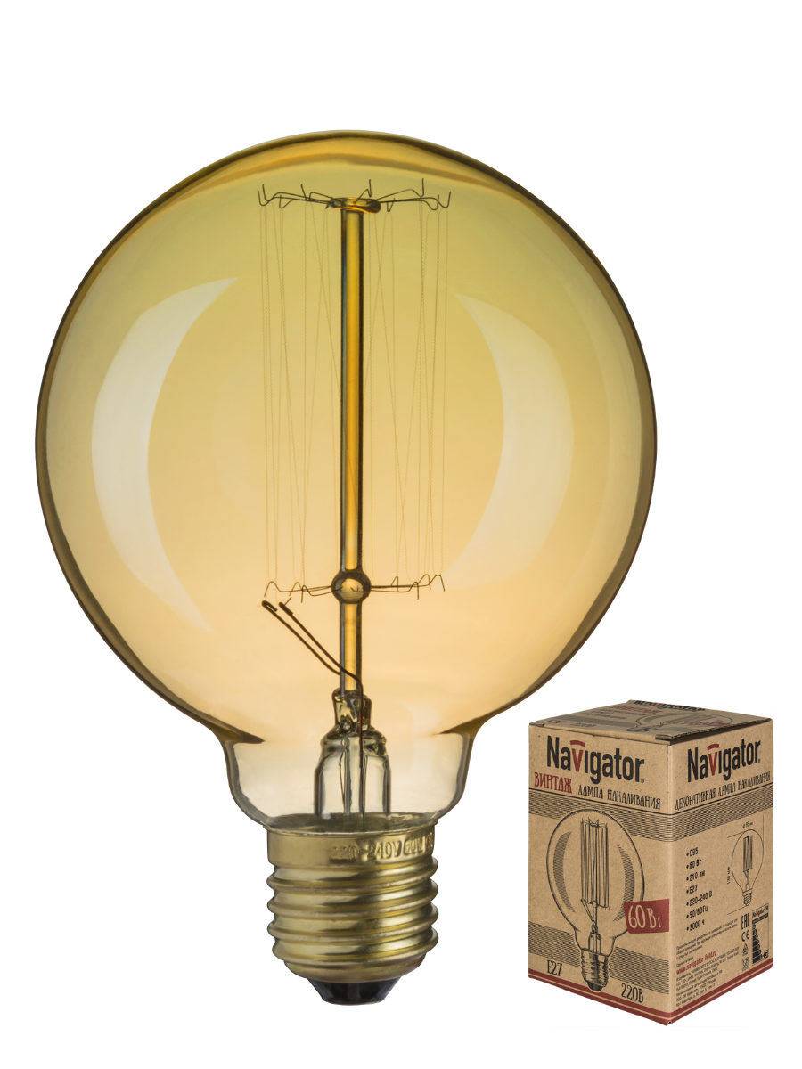Лампа накаливания E27 60Вт 230В G95 декоративная шар золотистый винтаж 71956 Navigator предназначена для освещения жилых и коммерческих помещений. Станет идеальным элементом оформления интерьеров в стиле лофт, ретро, винтаж, кантри, стим-панк и т.п. Имеет золотистую стеклянная колбу и предохранитель.
