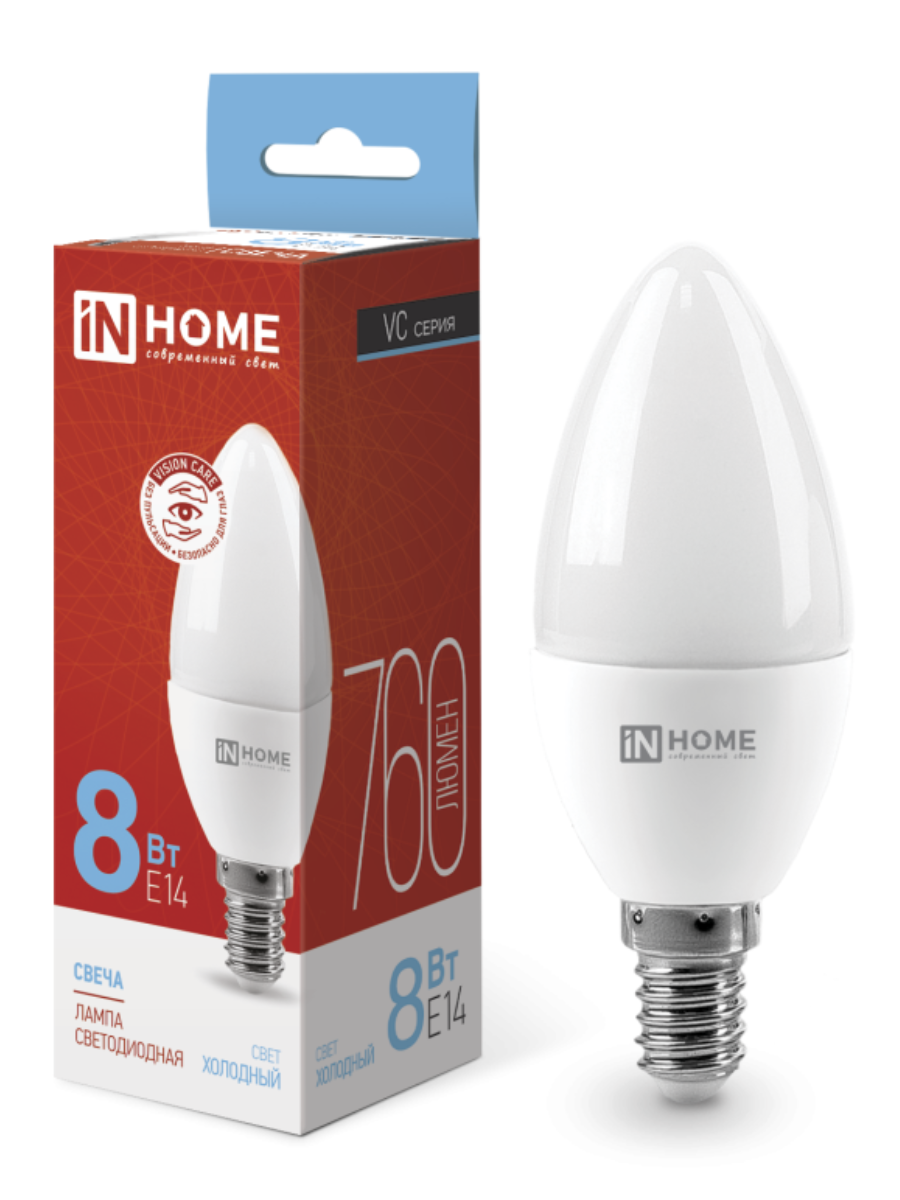 Лампа светодиодная LED-СВЕЧА-VC 8Вт холод. бел. 230В 6500К IN HOME с матовым рассеивателем представляет собой инновационный, экономичный и экологически безопасный источник света, в котором светообразующим элементом является диод. Предназначены для внутреннего освещения общественных и производственных помещений, интерьерной декоративной подсветки, общего, локального, акцентного и аварийного освещения.