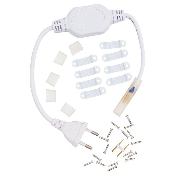 Монтажный комплект 03-42 для высоковольтной одноцветной светодиодной ленты предназначен для тех случаев, когда осветительную систему не хочется перегружать массивными источниками питания. Используется для подключения ленты к сети 230 В: один конец светодиодной ленты подключают к разъемам коннектора, с другой стороны устанавливают заглушку с целью изоляции открытых контактов. Также, при дополнительной герметизации силиконом, коннектор шнура питания обеспечивает степень защиты от пыли и влаги на уровне IP44 в месте соединения. Подходит для ленты 220 В со светодиодами smd2835 в количестве 120 диодов на 1 метр. Изделие демонстрирует стойкость к перепадам температур и воздействию ультрафиолетовых лучей. Фиксаторы и заглушки выполнены из прозрачного ПВХ, шнур питания – из белого пластика.