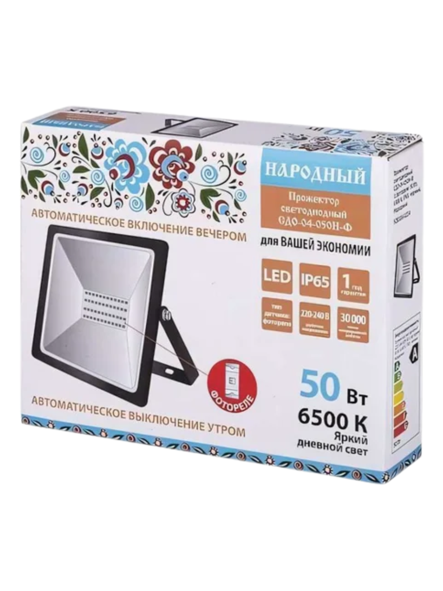 Прожектор светодиодный СДО-04-050Н-Ф (с фотореле) 50 Вт, 6500 К, IP65, черный, Народный