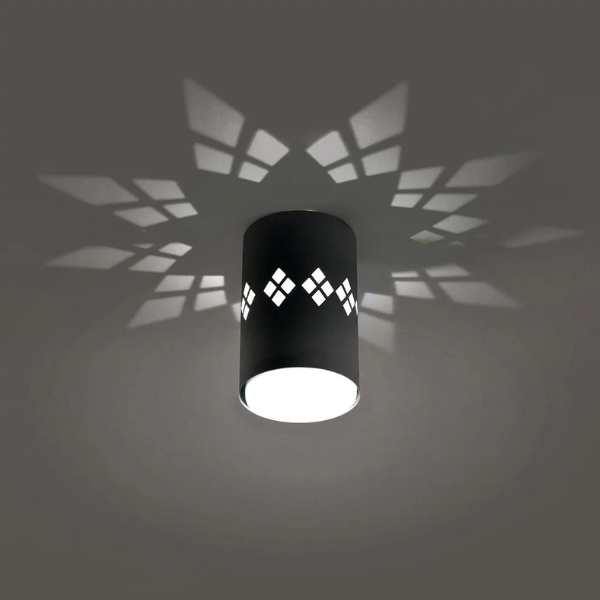 Светильник накладной спот HL351 св/д подсветка черный 80х80х100мм 41456 Feron под популярную лампу GX53 с подсветкой. Отверстия в металлическом плафоне и дополнительная подсветка создают интересные световые узоры на поверхности, на которой закреплён светильник. Все необходимое для монтажа включено в комплект. Патрон выполнен из плотного полимера РВТ, не поддерживающего горение. Прочный металлический корпус.