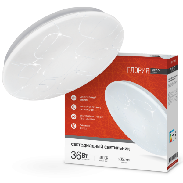 Светильник светодиодный 36Вт 230В 4000К ГЛОРИЯ DECO 025100 IN HOME предназначен для внутреннего освещения жилых помещений. Светильник светодиодный в белом цвете с простыми чистыми линиями, станет удачным решением лаконичных интерьеров. Современные светильники серии DECO, работающие на основе последнего поколения светодиодов, обеспечивают яркий равномерный световой поток при максимальной экономии электроэнергии. Отсутствие пульсации гарантирует сохранность здоровья глаз. Светодиодные светильники являются одним из самых экологически безвредных источников света и не требуют специальной утилизации и переработки. Светильники получили сертификат таможенного союза EAC. Производятся по ГОСТу Р МЭК 60598-1-2011. Светильник применяется для работы в сетях переменного тока напряжением 230В ± 10% с частотой 50 герц. Перед установкой следует убедиться в правильности напряжения питающей сети и наличии защитного устройства в цепи (автоматический выключатель, предохранитель).