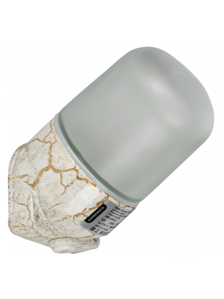 Светильник для бани керамич/стекло 60Вт Е27 IP54 наклонный белый мрамор GENERICA TERMA применяется в бытовых помещениях с высоким содержанием пыли и влаги, а также с предельной температурой окружающей среды до +130°С, например, в банях и саунах.