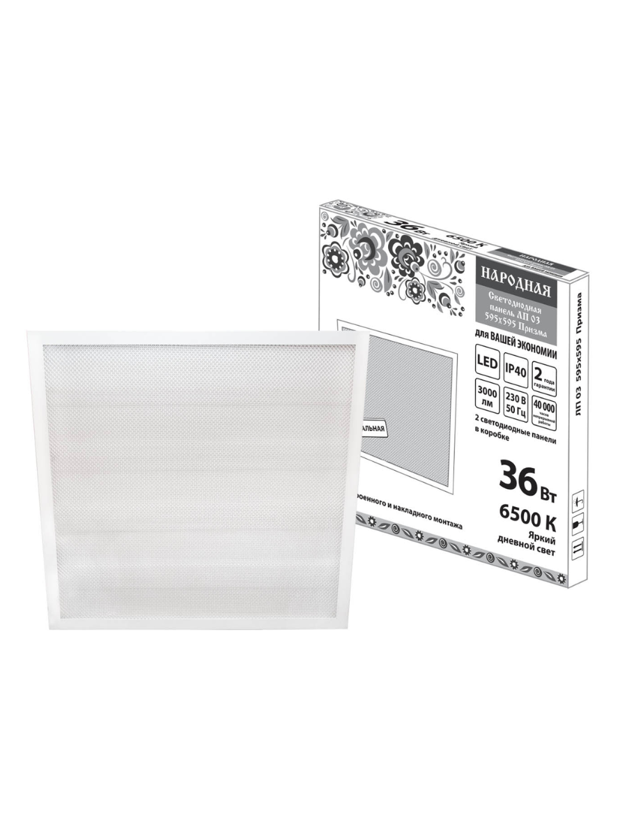 Универсальные светодиодные светильники ЛП имеют широкий диапазон питающего напряжения 180-265 В, драйвер встроен в корпус, потребляемая мощность 36 Вт, световой поток 3000 лм, цветовая температура 6500 К, рассеиватель ПРИЗМА из полистирола, габариты 595х595х19 мм, степень защиты IP40, диапазон рабочих температур от -10 до +40 °С, гарантия 2 года.