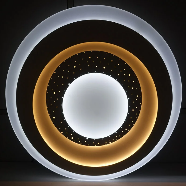 Светодиодный светильник-люстра Celebrity с пультом 120W 2K-4K-6K d500x50 LE 061202-013 LEEK имеет необычную внешность благодаря технологии двойного цвета свечения: теплые, холодные и затемненные участки поверхности образуют узор в виде нескольких кругов. Светодиоды расположены в торцах и освещение происходит через специальный полупрозрачный рассеиватель. На матовых вставках остается тень, которая на контрасте подчеркивает формы светильника. Выглядит очень современно и стильно: как будто осветительный прибор раскрашен яркими голубыми и желтыми светящимися красками. Обладает возможностью изменения освещения: теплый свет (3000К), дневной свет (4500К), «холодный» свет (6500К) и плавной регулировкой яркости и цветовой температуры. У светильника есть функция ночного освещения со сниженным потреблением электроэнергии, а также функция памяти, позволяющая запоминать предпочтительный режим освещения. Возможность управления двумя светильниками с помощью одного пульта. Управление функциями светильника производится с помощью пульта дистанционного управления, входящего в комплект поставки, либо с помощью выключателя. Световой поток - 5400-8500 Лм.