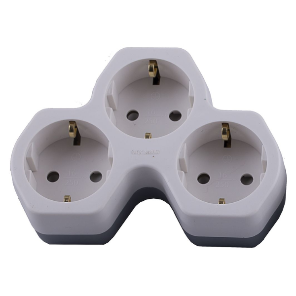 Разветвитель (тройник) 3 розетки 16A с заземлением, бел./серый 32871 STEKKER применяется для одновременного подключения нескольких нагрузок к одной розетке.