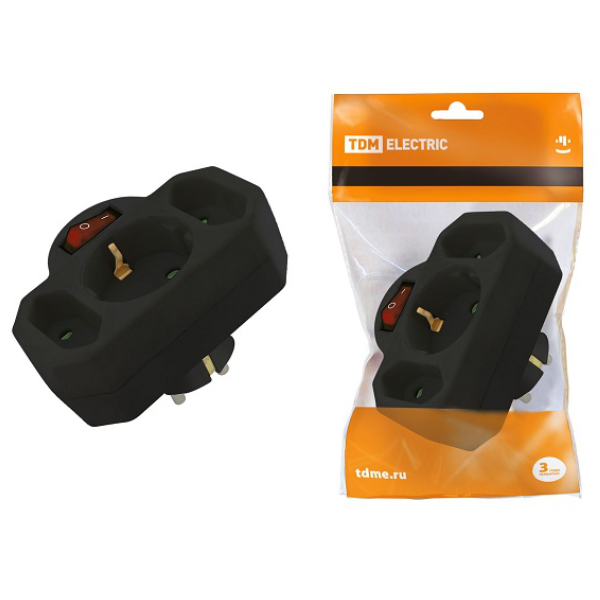 Разветвитель с заземлением на 3 гнезда с выключателем с индикацией: 1x2П+3 16А+2х2П 2,5А под плоскую вилку 250B черный SQ1806-0302 TDM применяется для одновременного подключения нескольких нагрузок к одной розетке.