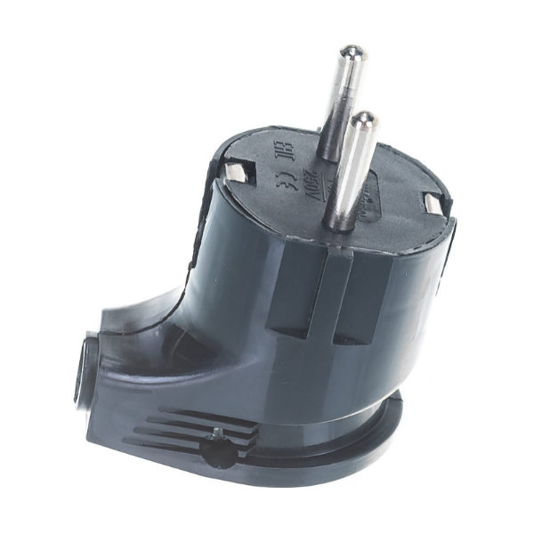 Вилка электрич. с заземл. угл. черн. 16А 250В (еврослот) UNIVersal А0105 – электроустановочный аксессуар, применяемый для подключения к сети бытовых электроприборов. Тип "евро", с заземлением. Вилка разборная, изготовлена из пластмассы, устойчивой к оплавлению, ударопрочная, устойчив к износу.