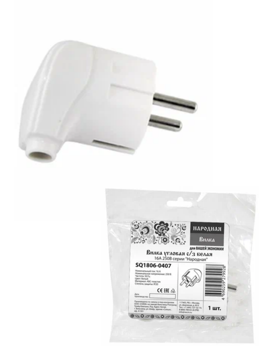 Вилка угловая с/з белая 16А 250В серии "Народная" SQ1806-0407 TDM Electric с заземлением белого цвета от бренда Народная. Этот продукт идеально подходит для использования в жилых и коммерческих помещениях. Корпус устройства выполнен из самозатухающего АБС-пластика, что обеспечивает его прочность и устойчивость к воздействию солнечных лучей. Вилка имеет степень защиты IP20.