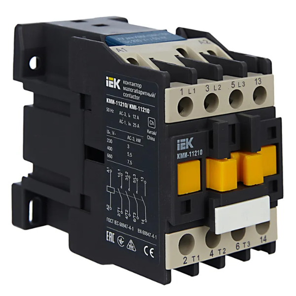 Контактор КМИ-11210 12А 230В/АС3 1НО IEK KKM11-012-230-10 предназначен для пуска, остановки и реверсирования асинхронных электродвигателей с короткозамкнутым ротором на напряжение до 660 В (категория применения АС-3), а также для дистанционного управления цепями освещения, нагревательными цепями и различными малоиндуктивными нагрузками (категория применения АС-1). Все исполнения на ток нагрузки до 40 А имеют одну группу замыкающих или размыкающих дополнительных контактов. Исполнения на ток нагрузки свыше 40 А - две группы (замыкающую и размыкающую).