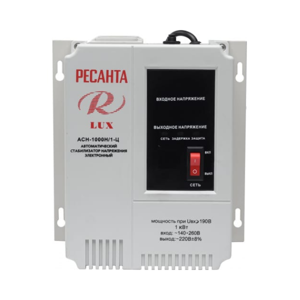 Стабилизатор напряжения серии LUX РЕСАНТА АСН-1000Н/1-Ц релейного типа предназначен для выравнивания входного напряжения и защиты приборов от перепадов напряжения с суммарной мощностью до 1 кВт. Превышение пределов поддерживаемого входного напряжения автоматически отключает подачу питания. Оснащен фильтрами сетевых помех, предотвращающими искажение частотной синусоиды, микропроцессорным управлением и цифровым индикатором напряжения. Данный стабилизатор оборудован розеткой для подключения потребителей с мощностью до 1000 Вт.