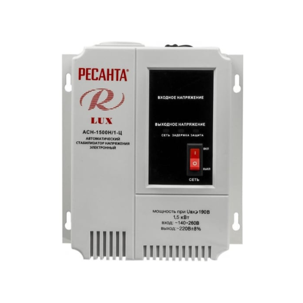 Стабилизатор пониженного напряжения серии LUX РЕСАНТА АСН-1500Н/1-Ц релейного типа предназначен для выравнивания входного напряжения и защиты приборов от перепадов напряжения с суммарной мощностью до 1,5 кВт. Превышение пределов поддерживаемого входного напряжения автоматически отключает подачу питания. Оснащен фильтрами сетевых помех, предотвращающими искажение частотной синусоиды, микропроцессорным управлением и цифровым индикатором напряжения. Данный стабилизатор оборудован розеткой для подключения потребителей с мощностью до 1500 Вт.
