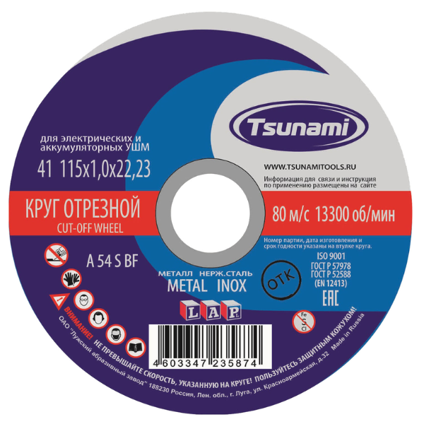 Диск отрезной по металлу/нержавейке 115*1*22мм TSUNAMI