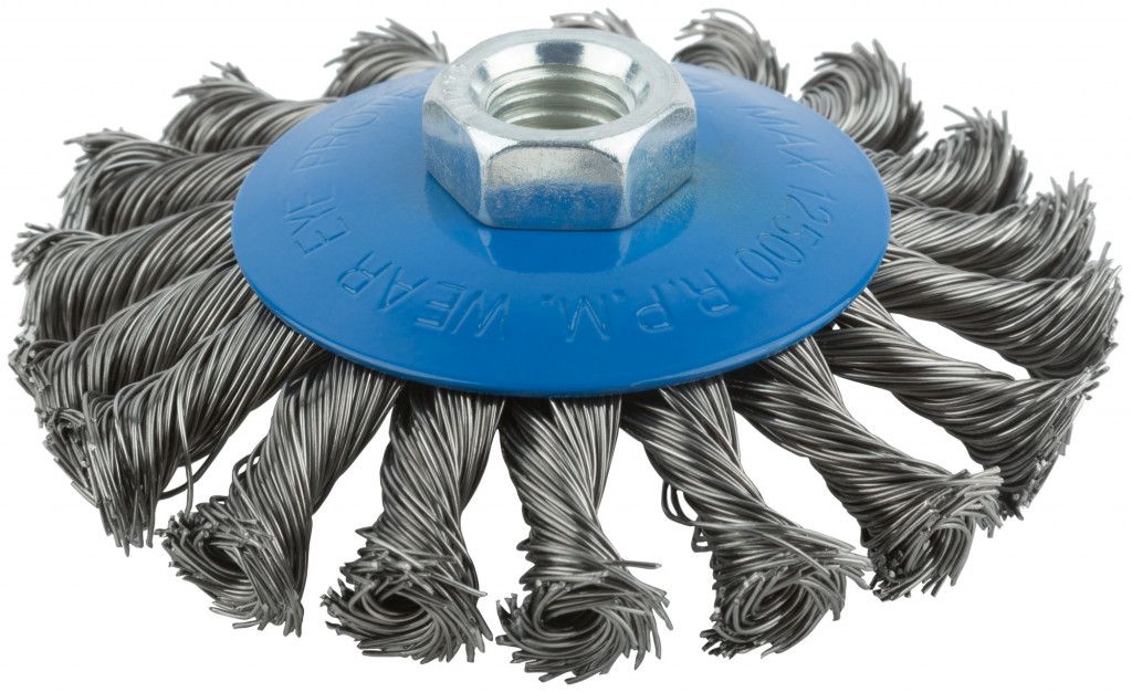 Щетка колесо с наклоном, гайка М14, стальная витая проволока 100 мм 38936М