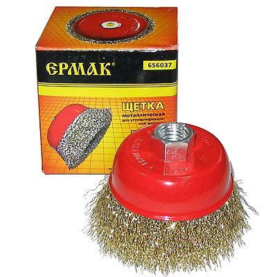 Щетка крацовка "чашка" 100мм М14 латунь Ермак применяется в качестве насадки на углошлифовальную машину.