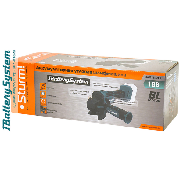 УШМ аккумуляторная Sturm б/щеточный 8500 об/мин (без З/У и АКБ) CAG1812BL Sturm применяется для резки, шлифовки, черновой обработки и полировки металлов, камней и керамических изделий с соответствующими насадками. Бесщеточный двигатель, более легкий и компактный по сравнению с щеточным аналогом, а также потребляющий меньше энергии аккумулятора, а значит и способный проработать дольше на одном заряде. Для быстрой смены оснастки предусмотрена возможность блокировки шпинделя, что способствует повышению производительности. Дополнительная двухпозиционная рукоятка наклонена к корпусу редуктора – такая конструкция повышает удобство рабочего процесса. Наличие усиленной защиты от пыли и оптимизированная аэродинамическая схема предохраняют электродвигатель от возможного перегрева, что увеличивает его эксплуатационный ресурс. Аккумуляторная угловая шлифмашина является частью системы 1BatterySystem. 1BatterySystem - универсальная аккумуляторная система. Подходит ко всей линейке аккумуляторного инструмента Sturm! Аккумуляторная угловая шлифмашина, в целях экономии, поставляется без аккумулятора и зарядного устройства. Вы можете использовать один аккумулятор данной системы для нескольких инструментов. Компания Sturm! гарантирует наличие в розничной сети аккумуляторов для данной аккумуляторной системы в течение, как минимум, 15 лет.
