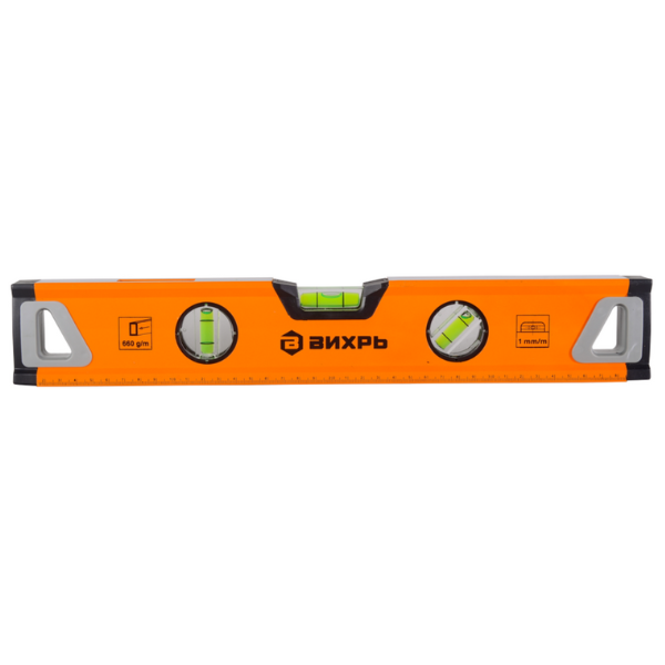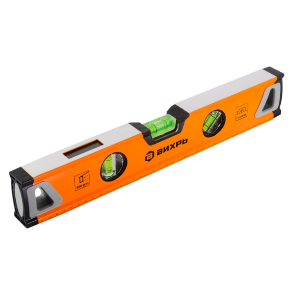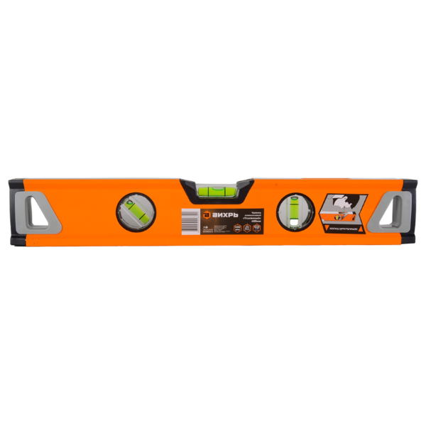Уровень алюминиевый 400мм усиленный, 3 глазка (1 зеркальный), 2 комп.рукоятки 73/11/4/9 ВИХРЬ используется при строительных, ремонтных и отделочных работах для поиска и исправления отклонения поверхностей. Корпус прочный и износостойкий, изготовлен из алюминия. Фрезерованная рабочая поверхность служит для уменьшения возможной погрешности при измерениях. Усиленный корпус уровня изготовлен из упрочненного прямоугольного алюминиевого профиля. Фрезерованная рабочая поверхность обеспечивает дополнительную точность измерения. В верхней части имеется окошко с зеркальным отражателем, позволяющее без ошибок снимать показания во фронтальной и поперечной плоскостях. Модель имеет три мерительных глазка для проверки отклонений по горизонтали, вертикали и под углом 45 градусов.