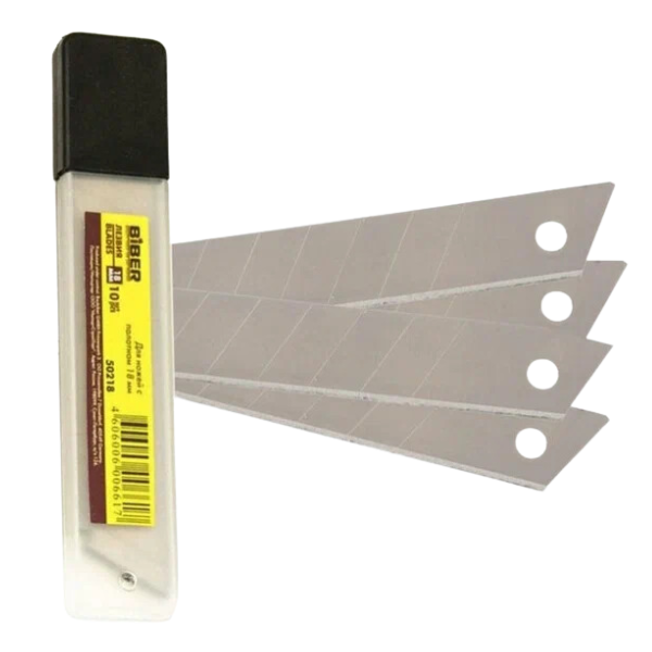 Лезвия сменные 18мм 50218 Biber используются совместно со строительными и канцелярскими ножами. Предназначены для разрезания тонких неплотных материалов: линолеума, картона, бумаги, пластика, кожи, резины и т.д.