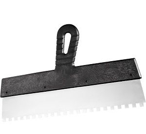 Шпатель фасадный зубчатый. Применяется для равномерного нанесения на различные поверхности клеевых растворов, иных отделочных материалов и их последующего разравнивания с образованием борозд.