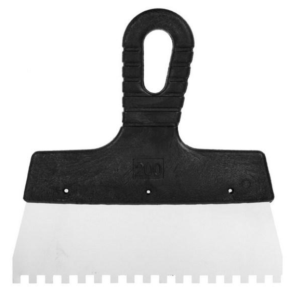 Шпатель малярный 200мм зуб 6х6мм 1205106 KORVUS используется для равномерного нанесения на различные поверхности клеевых растворов, иных отделочных материалов и их последующего разравнивания с образованием борозд. Профилированное полотно шпателя изготовлено из высокоуглеродистой нержавеющей стали, прошедшей специальную термическую обработку для придания ей свойств «памяти» (при изгибе лезвие принимает исходное положение). Пластмассовая рукоятка надежно скреплена с полотном и оснащена отверстием для подвески.