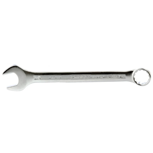 Ключ комбинированный 27мм 15144 GROSS применяется для монтажа/демонтажа резьбовых соединений. Ключ изготовлен из высококачественной хромованадиевой (Crv) стали методом холодного штампа. Ключ с одной стороны оснащен захватом открытого типа — рожковым и накидным (кольцевым) с другой стороны. Профиль кольцевого зева имеет 12 граней, что увеличивает площадь соприкосновения рабочих поверхностей и снижает риск деформации граней крепежа при монтаже. Угол наклона кольцевого зева относительно плоскости ключа в 15° делает монтаж более удобным. Хромоникелевое покрытие ключа улучшает антикоррозийные свойства инструмента.