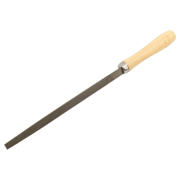 Напильник трехгранный 200мм с деревянной ручкой предназначен для удаления заусенцев, обработки углов и небольших плоских поверхностей.