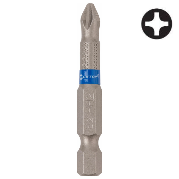 Бита PH 2х50мм 83-326 CUTOP - это специальная насадка с помощью которой закручивают и выкручивают саморезы, гайки, болты. Биты с маркировкой PH это крестовые насадки разных размеров, чем больше цифра, тем крупнее крест, и соответственно, тем для большего самореза она предназначена. Биты PH используются для черных саморезов по металлу, по дереву, оцинкованных саморезов с прессшайбой. Намагниченный шлиц, антискользящие риски. Бита изготавлена из тайваньской стали высшего качества марки S2. Ребра биты производятся с помощью холодной штамповки в соответствии с точной спецификацией. Кончик проходит специальный процесс закалки при температурах до 870°C.