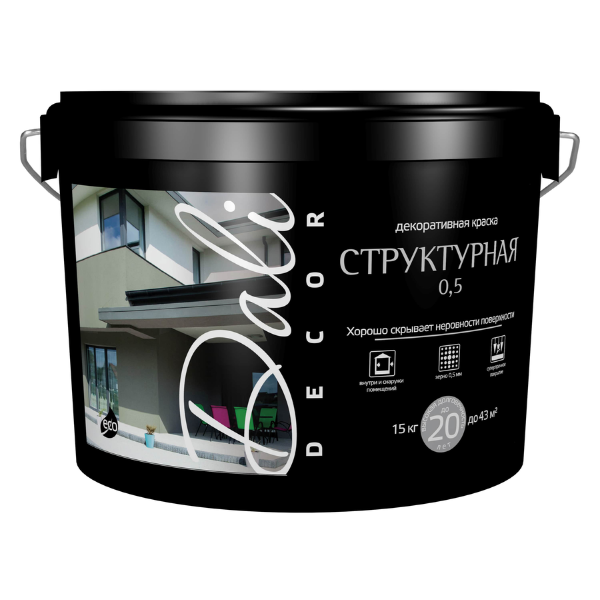 Краска ВД фактурная-декоратив. "Структурная 0,5" 15 кг DALI предназначена для защитно-декоративной обработки фасадов зданий и сооружений, стен, потолков и различных элементов интерьера в отапливаемых и неотапливаемых жилых и общественных помещениях, в том числе с повышенной влажностью воздуха и интенсивной эксплуатационной нагрузкой.