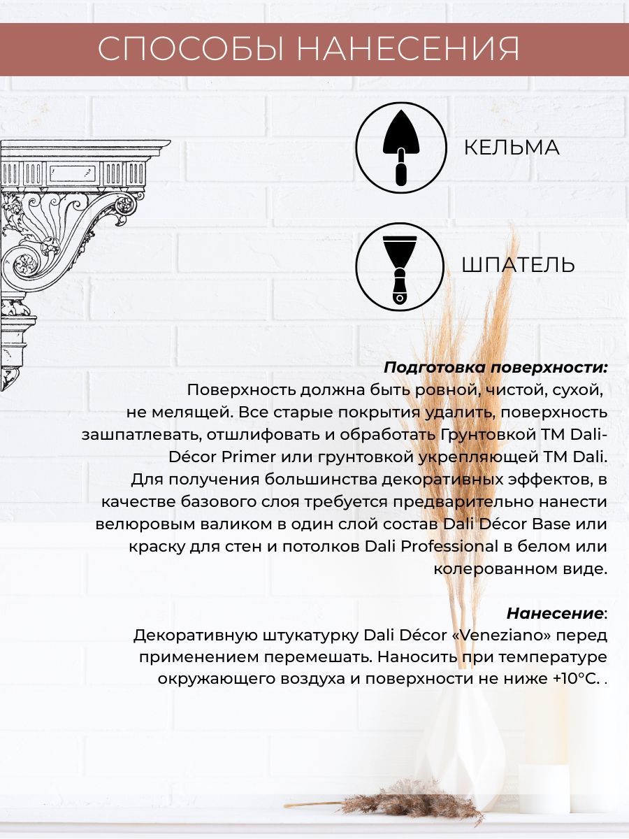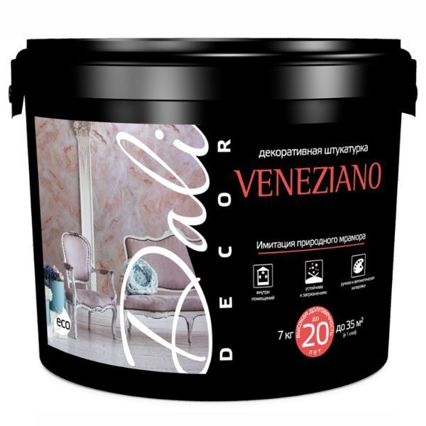 Декоративная штукатурка DALI-DECOR Венецианская (7 кг) это тонкослойное покрытие, предназначенное только для внутренних работ. Область применения материала достаточно широка, наносить его можно по различным минеральным основаниям (кирпич, камень, бетон, штукатурка), гипсокартону, МДФ, ДСП, ДВП, оргалиту, что позволяет создавать неограниченное количество индивидуальных неповторимых рисунков, обладает отличной адгезией и выдерживает легкую влажную уборку без применения абразивных моющих средств. Для работы, в зависимости от выбранного эффекта покрытия, вам необходимо будет купить следующие инструменты: венецианская кельма, металлический шпатель, резиновый структурный шпатель, фактурный валик, кисть с жестким ворсом, аппликатор из искусственной замши, морская губка, варежка для нанесения воска и полировочная машинка для полировки.