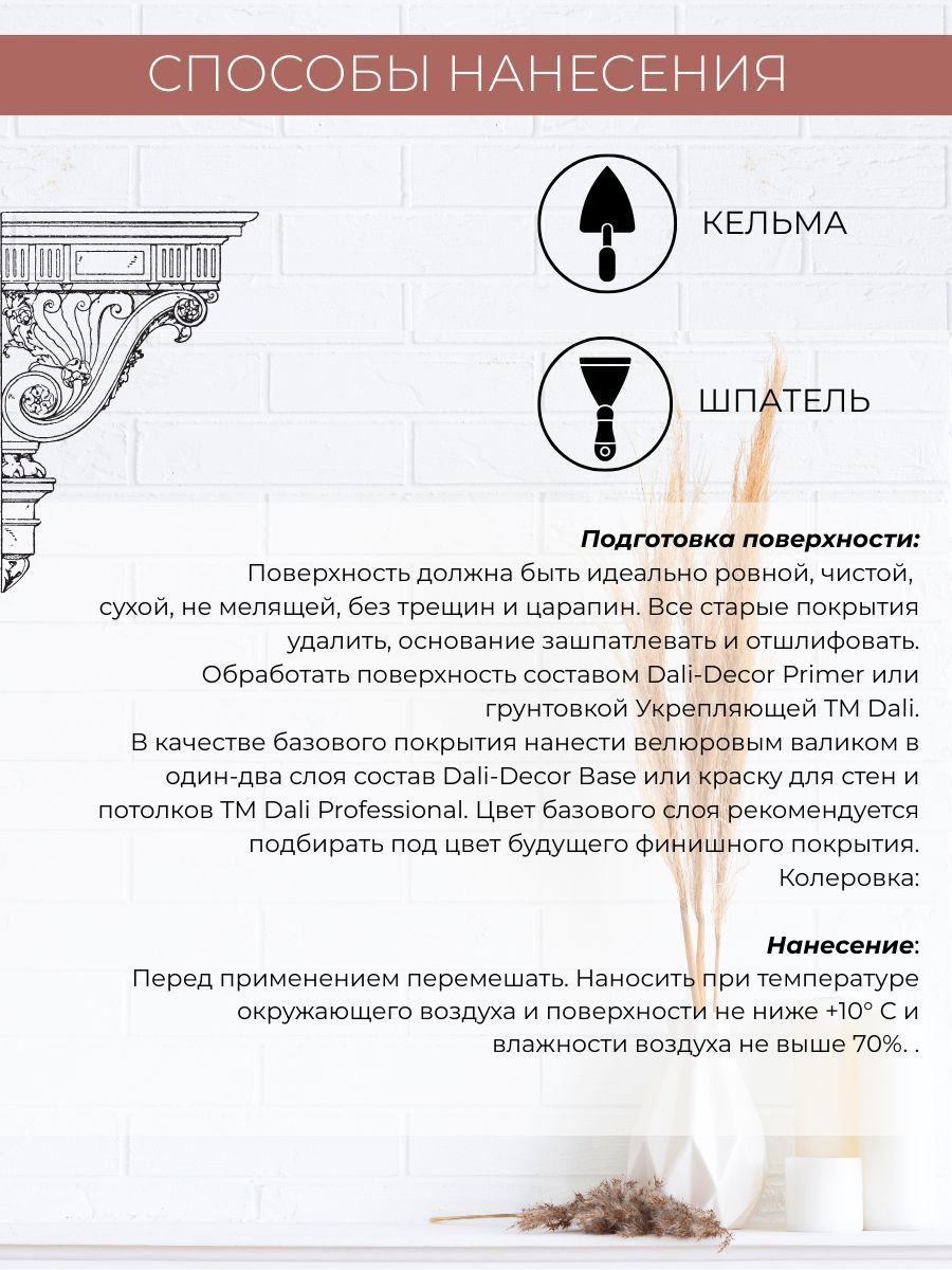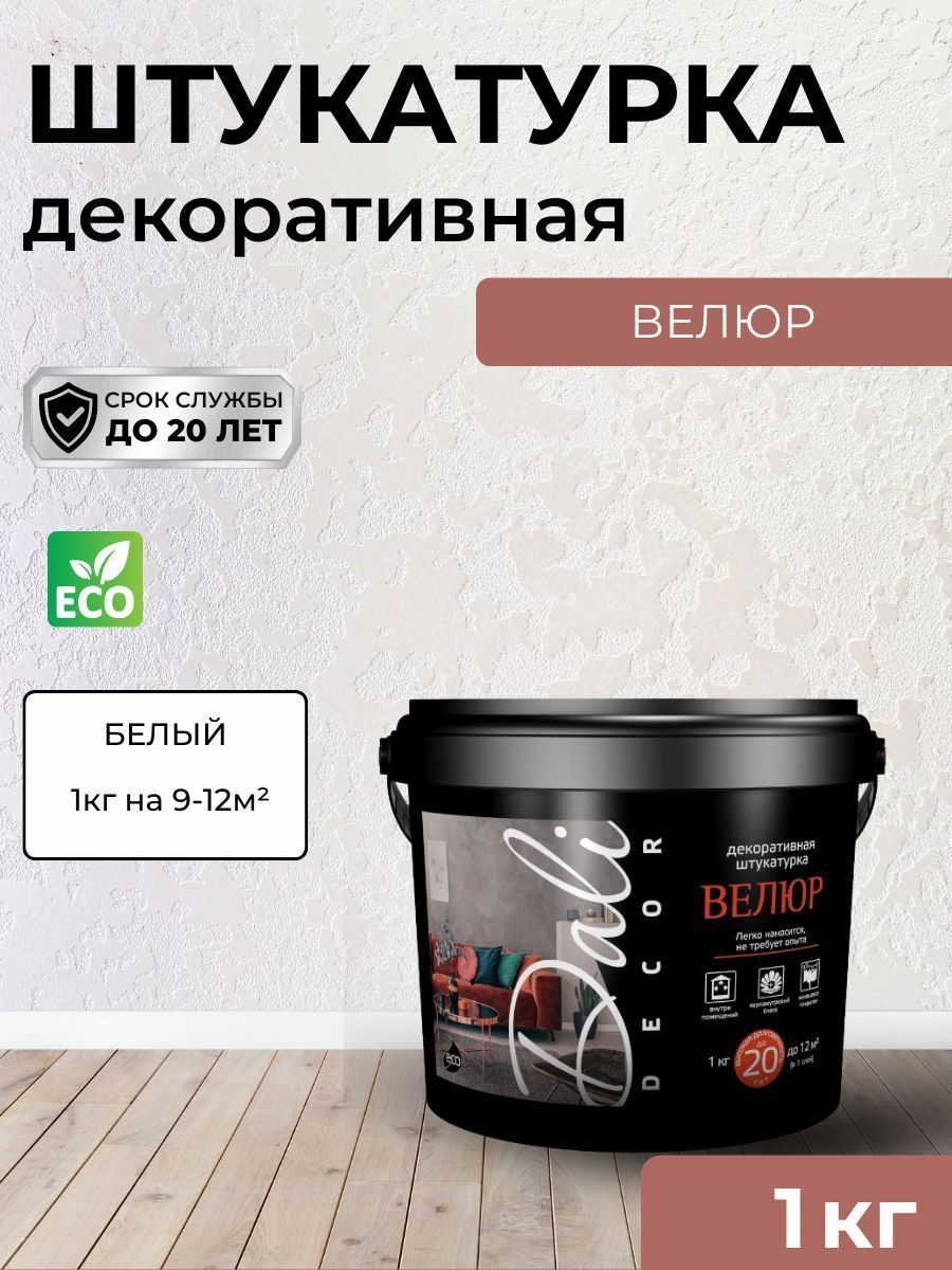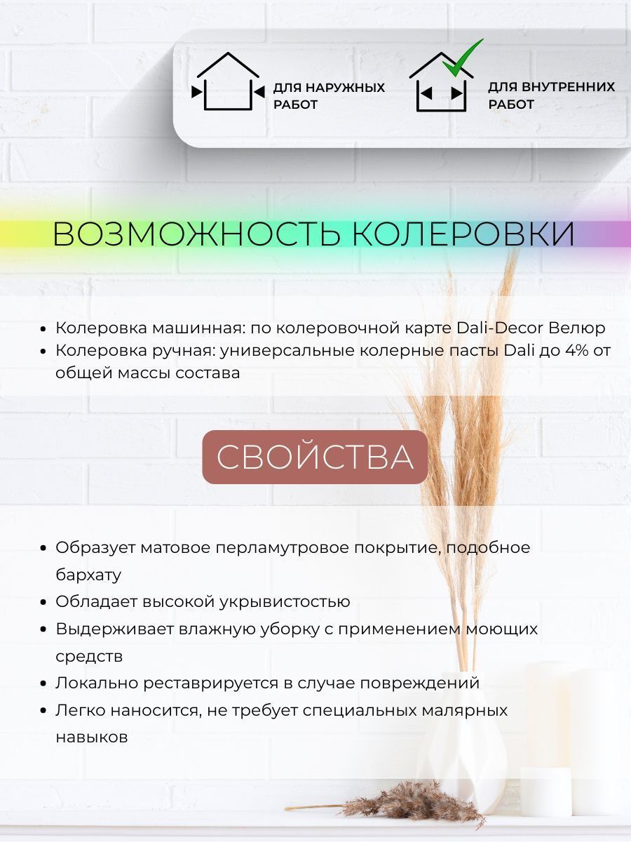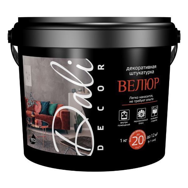 Декоративная штукатурка Велюр 1кг DALI-DECOR для внутренних работ, создает перламутровое покрытие, подобное бархату. Срок службы: до 20 лет. Применяется для защитно-декоративной обработки стен, колонн, потолков и различных элементов интерьера в отапливаемых и неотапливаемых жилых и общественных помещениях, в том числе в помещениях с интенсивной эксплуатационной нагрузкой.