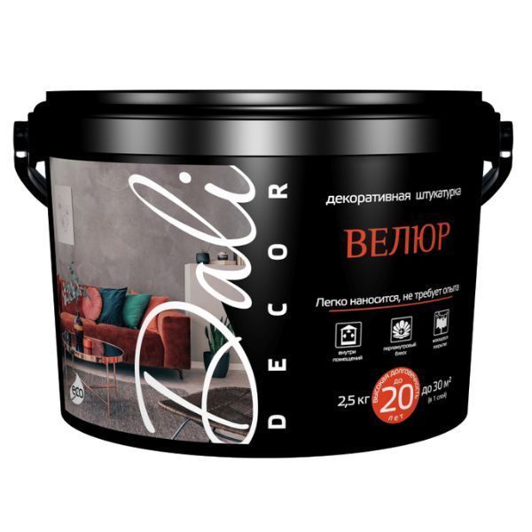 Декоративная штукатурка Велюр 2,5кг DALI-DECOR для внутренних работ, создает перламутровое покрытие, подобное бархату. Срок службы: до 20 лет. Применяется для защитно-декоративной обработки стен, колонн, потолков и различных элементов интерьера в отапливаемых и неотапливаемых жилых и общественных помещениях, в том числе в помещениях с интенсивной эксплуатационной нагрузкой.