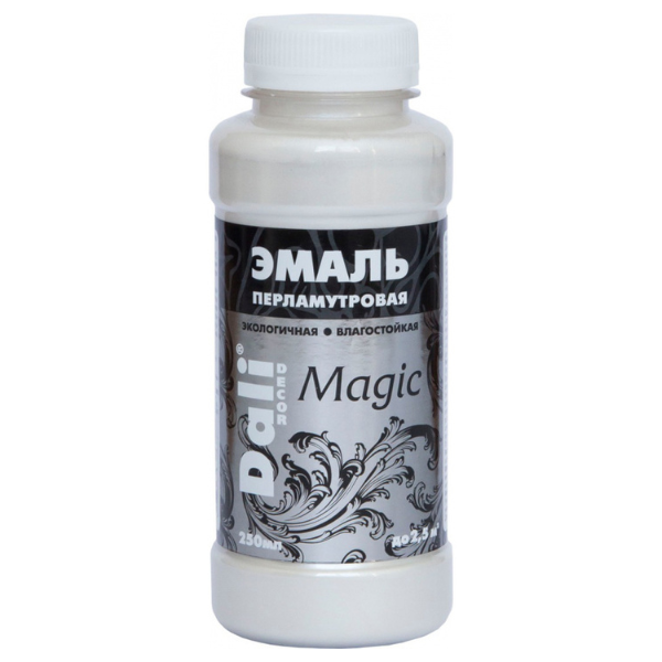 Эмаль акриловая перламутровая (0,25 л) DALI DECOR Magic СЕРЕБРО применяется для декоративного и художественного окрашивания в цвета благородных металлов с перламутровым блеском различных элементов и деталей интерьера, предметов и изделий декоративного и прикладного искусства. Применяется внутри и снаружи помещений по новым и ранее окрашенным поверхностям: минеральным (кирпич, камень, бетон и пр.), деревянным и материалам на основе древесины (ДВП, ДСП, фанера и пр.), загрунтованным металлическим, оцинкованным, керамическим, стеклянным, пенополиуретановым и пластиковым поверхностям, любым типам обоев.