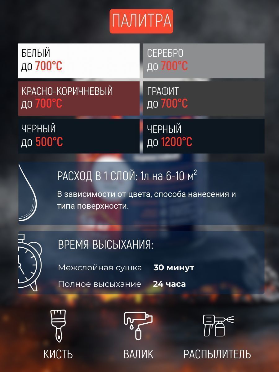 Для профессионального и бытового применения для защиты и декоративной окраски металлических поверхностей, эксплуатируемых при температуре от -60 до 700°С - печей, каминов, мангалов, выхлопных систем, деталей двигателей, нагревательных котлов, газопроводов, трубопроводов и других металлоконструкций, подверженных нагреванию. Допускается нанесение на минеральные поверхности (бетон, кирпич, железобетон и др), эксплуатируемых при температурах до 300°С.