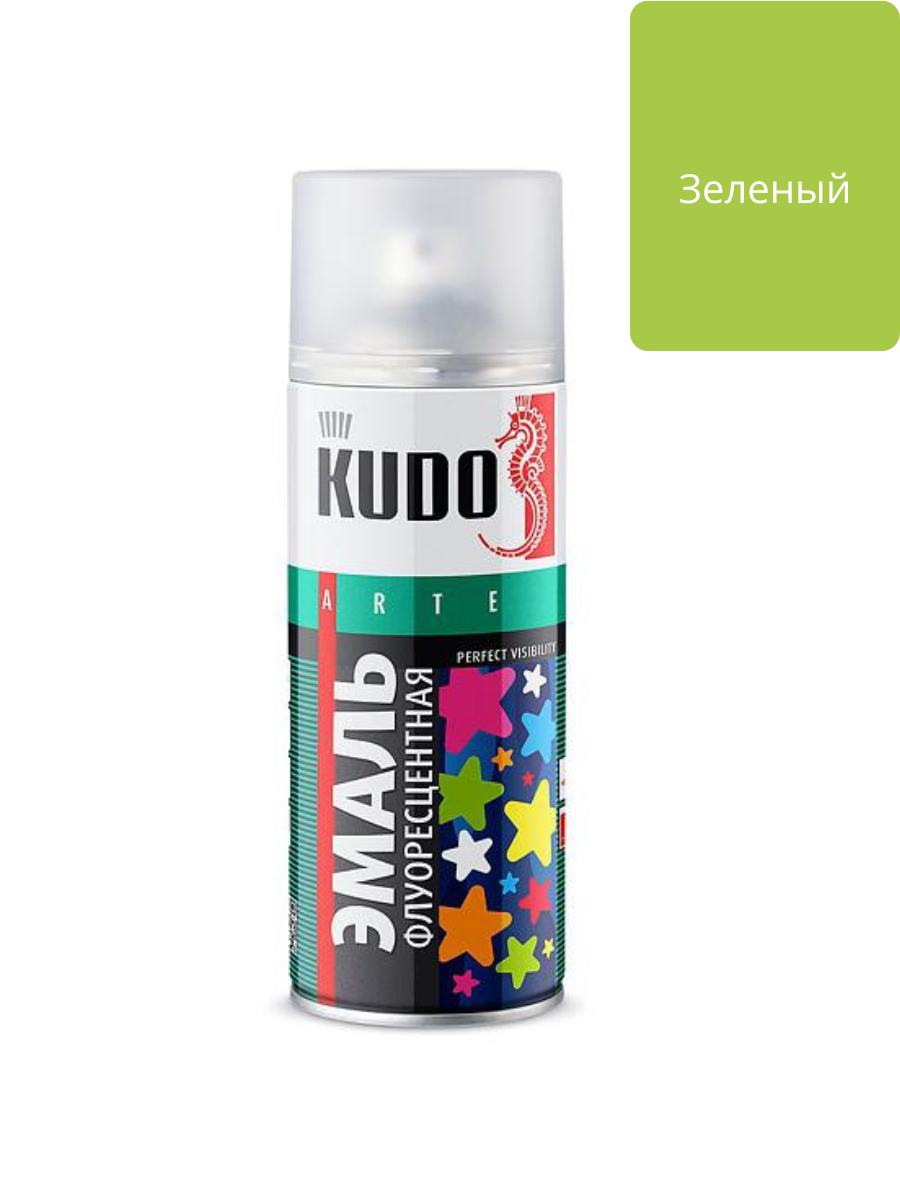 Эмаль флуоресцентная 520мл зеленая KU-1203 KUDO со светоотражающей способностью для создания предупредительных и сигнальных эффектов на дорожных знаках и технике, станках, ступенях, элементах ограждений, а также для оформительских работ и декоративного окрашивания. При ультрафиолетовом облучении интенсивность свечения эмали увеличивается.