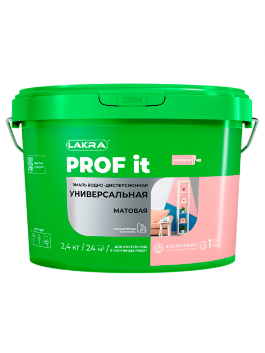 Эмаль акриловая универсальная База А белый матовый 2,4кг ЛАКРА PROF IT на основе акриловой дисперсии для внутренних и наружных работ. Предназначена для окраски минеральных и деревянных поверхностей, не подвергающихся плотному соприкосновению (отсутствие последующего контакта окрашенных поверхностей между собой). Обладает отличной укрывистостью и адгезией к большинству строительных материалов. Быстро высыхает. Создает прочное влагостойкое, атмосферостойкое, паропроницаемое и светостойкое покрытие. Не желтеет со временем. Отличается высокими декоративными и защитными свойствами, стойкая к мытью.