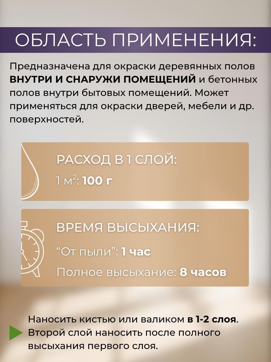Время высыхания (20°С и относительной влажности 65%): «От пыли» – 1 ч, полное – 8 ч. Покрытие беречь от воздействия воды в течение 2 суток после окрашивания. Полная механическая прочность достигается через 2 недели. Ходить по окрашенной поверхности можно через 4 часа, расстановка мебели допускается через 5 дней.