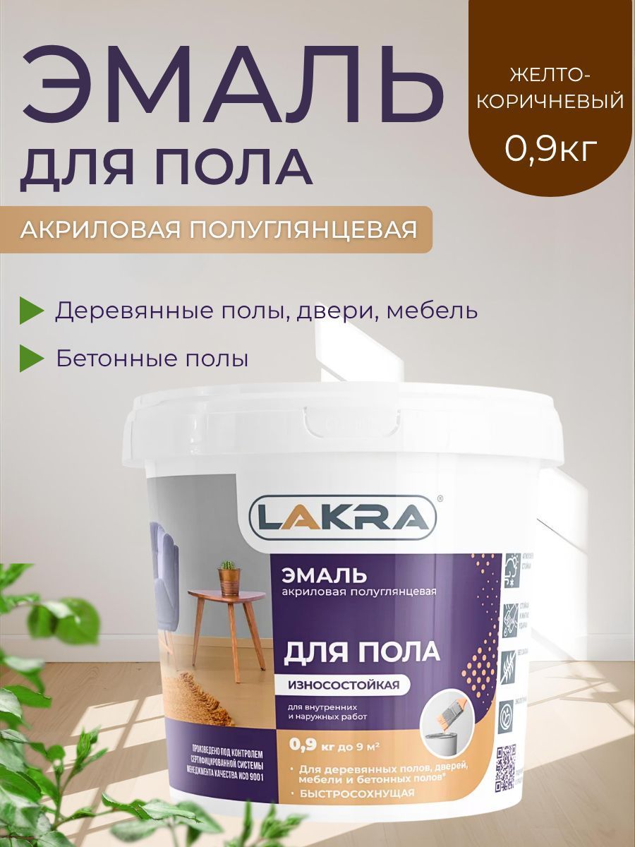 Эмаль акриловая для пола желто-коричневая 0,9кг Лакра применяется для для окраски деревянных полов внутри и снаружи помещений и бетонных полов внутри бытовых помещений. Может применяться для окраски дверей, мебели и др. поверхностей. Высококачественная водоразбавляемая эмаль на основе акриловой дисперсии. Быстро высыхает. Образует полуглянцевую поверхность, стойкую к механическим воздействиям, влаге и истиранию. Отличается высокими декоративными и защитными свойствами, стойкая к мытью. Готова к